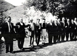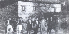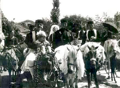 | Γάμος στη Βλάστη, 1936. Μεταφέροντας τη νύφη απο το γειτονικό χωριό Νάματα. Γάμος του Κουλούσια Απόστολου Μητρούλη και της Σουλτάνας Μπαρτζώκα. Αρχείο Γιάννη Βαρβαρούση |